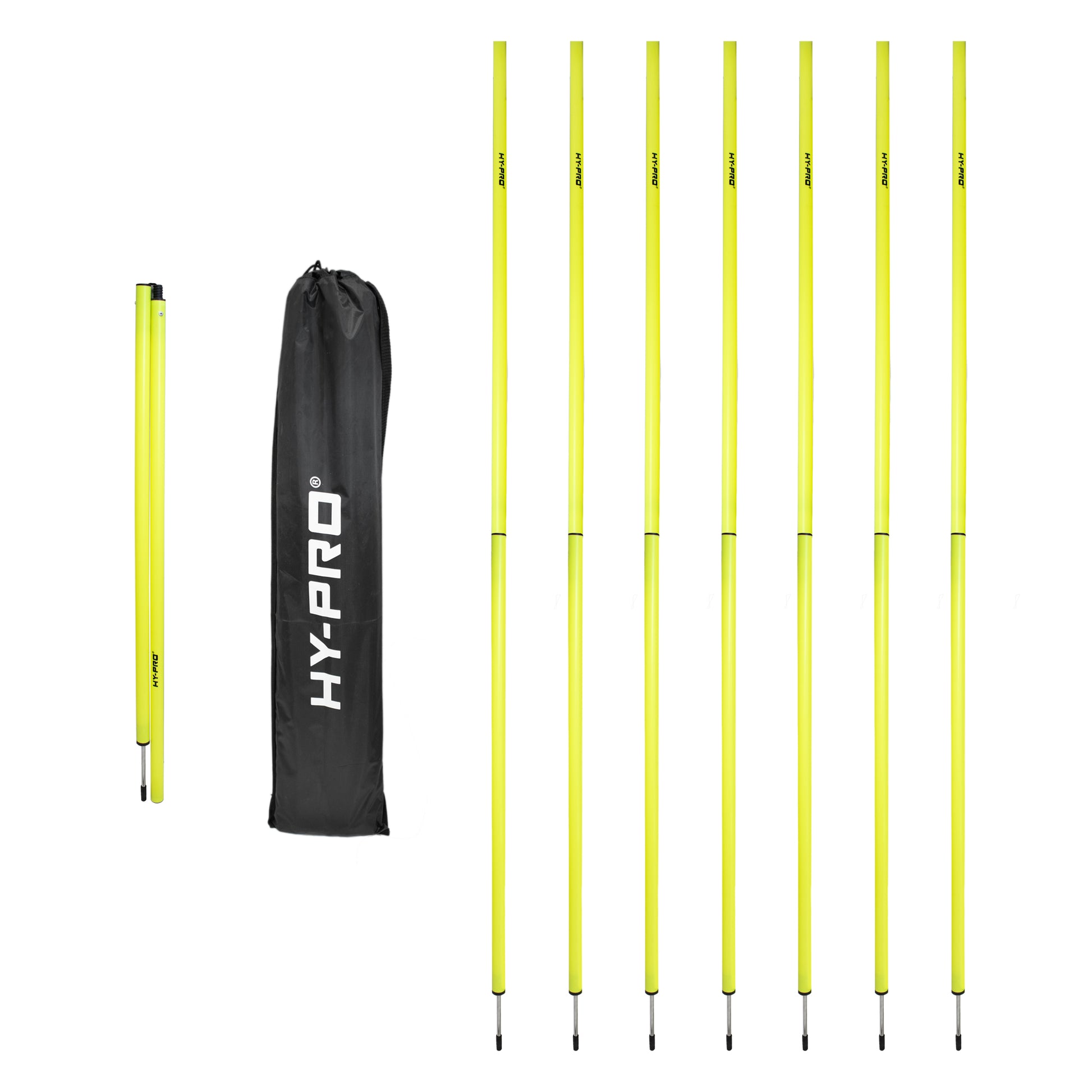 - COMPLETE SET: 8 high-visibility yellow agility poles with ground spikes and a convenient carrying bag for easy transport and storage.